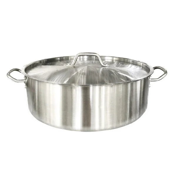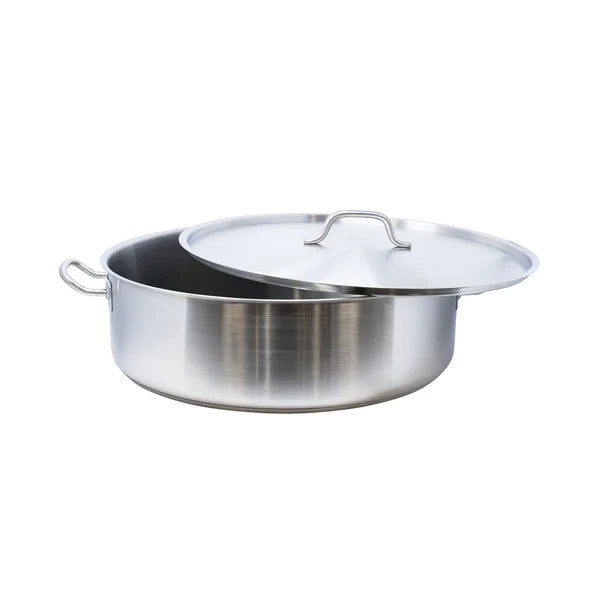 Made from professional quality stainless steel, this brazier is highly durable and certified for commercial use. It features thick aluminum base between two layers of stainless steel allows for even heat distribution across the surface. It's ideal for gas, ceramic, halogen, electronic, and induction cooktops.
